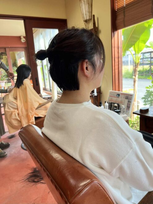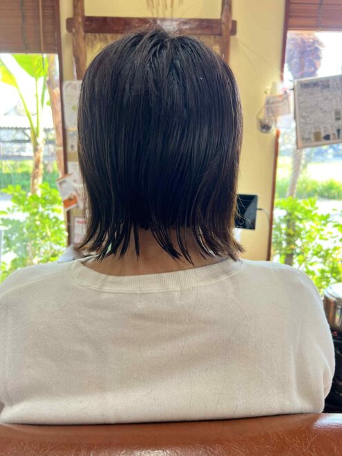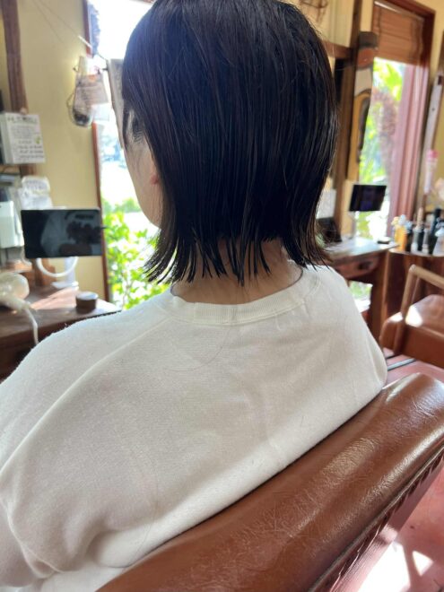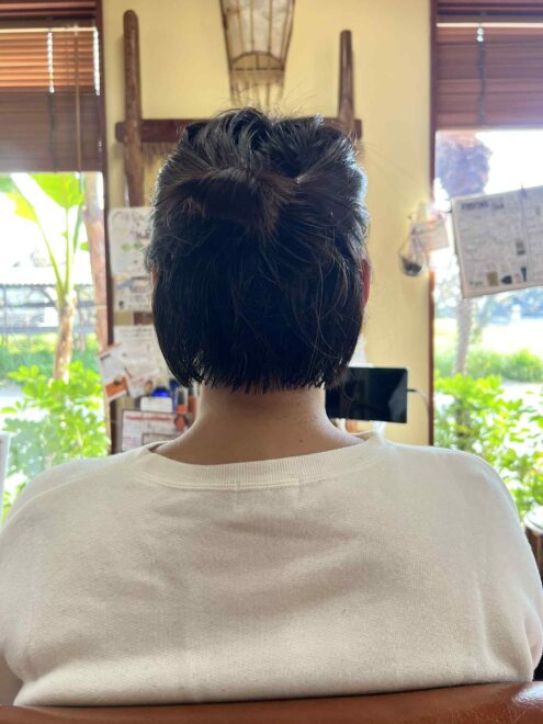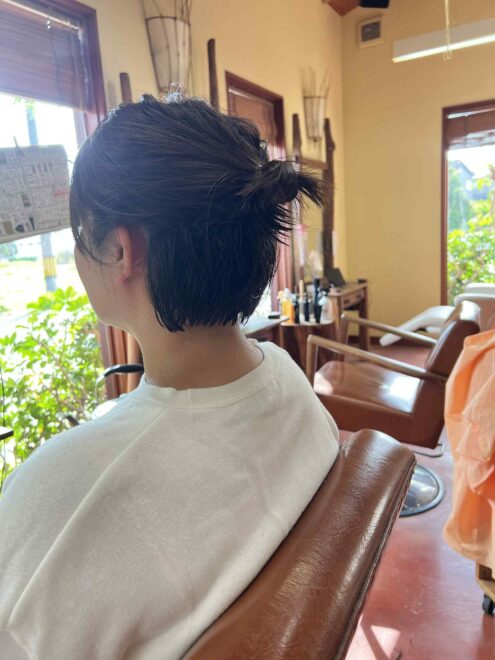 → 襟足の内側を短くカットすることで、驚くほど髪の量が減り、軽くなります。